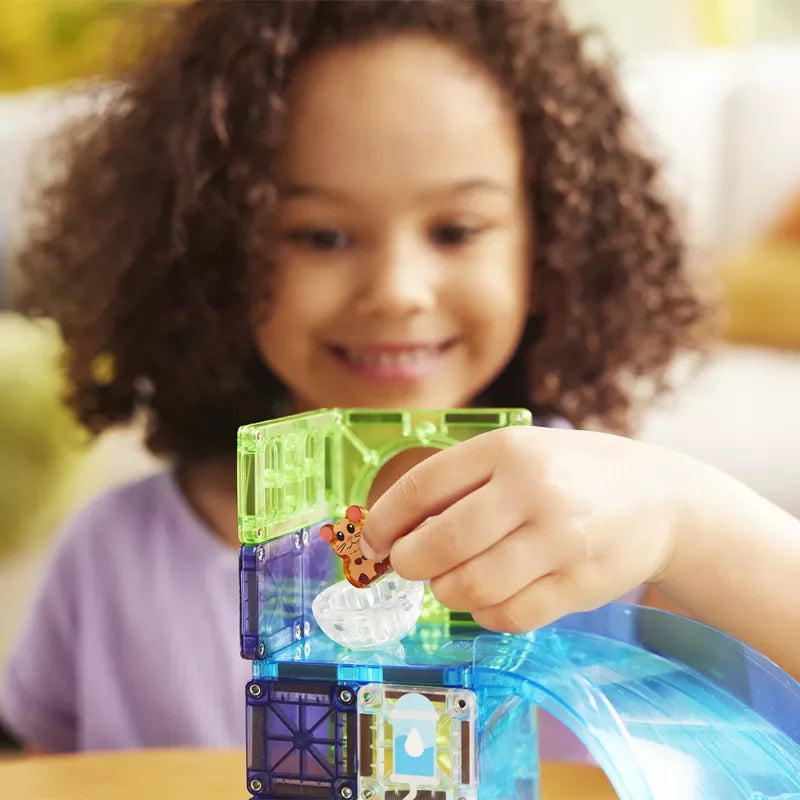 Prepárate para horas de entretenimiento con este creativo set de Magna-Tiles que incluye un divertido tobogán con bola para hámster. El set combina construcción, movimiento y estrategia con 13 piezas magnéticas que permiten crear pistas y circuitos para que el hámster magnético ruede por curvas y giros, estimulando la imaginación y la motricidad fina.