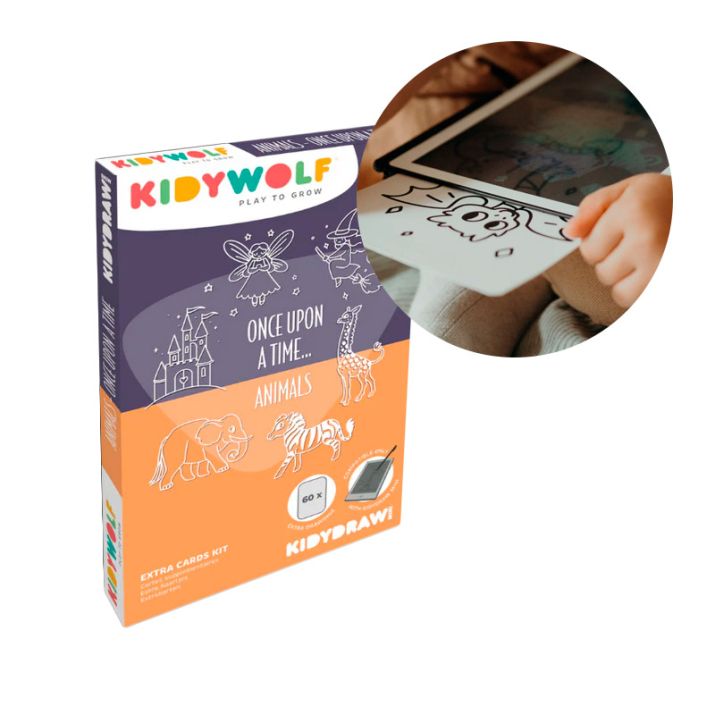 Este completo set de plantillas reversibles transforma tu tableta Kidydraw en un universo infinito de historias y aventuras. Incluye 30 tarjetas doble cara con un total de 60 imágenes fascinantes de cuentos clásicos y animales del mundo, perfectas para calcar sobre la pantalla LCD semitransparente de 8,5" de tu Kidydraw y crear magia en cada trazo.