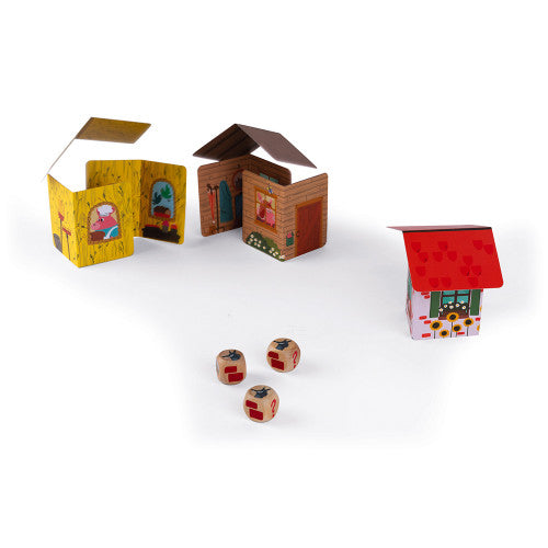 Ayuda a los 3 cerditos a construir sus casas con ayuda de los 3 dados. ¡Pero cuidado con el lobo! Si tiras los dados y te sale la cabeza del lobo en 2 de ellos, ¡te conviertes en el gran lobo feroz que sopla sobre las casas de los otros cerditos! De 2 a 6 jugadores. 54 cartas 7 x 10,5 cm y 3 dados de madera.