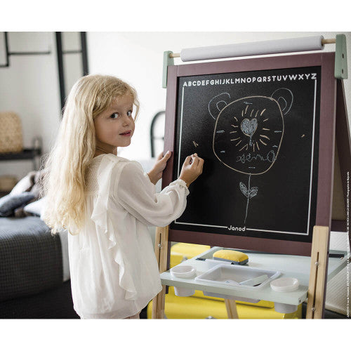 Sus primeros dibujos y sus primeras palabras… ¡qué alegría poder hacerlos a gran escala en una pizarra evolutiva que le recordará a la del cole! Esta bonita pizarra de madera, de tonos suaves, permitirá al niño expresar su creatividad en dos superficies, a su altura. Es regulable y las patas ajustables permiten que pase de medir 91 a 126 cm de altura. ¡Así el niño podrá utilizar esta pizarra durante más tiempo! Tres tonos que combinan perfectamente hacen resaltar a este bonito juguete de dos caras: marco marrón, patas de madera natural y detalles verdes en el resto de la pizarra. Tiene un lado blanco magnético para escribir con rotulador borrable y jugar con imanes, por ejemplo, y otro lado de pizarra negra para escribir con tiza. Los niños disfrutarán de muchos accesorios: seis imanes redondos a juego con la pizarra, diez tizas, un rotulador de borrado en seco, un rollo de papel, un borrador de pizarra y una regla magnética. Esta práctica pizarra es plegable para guardarla fácilmente. Ideal a partir de 3 años.