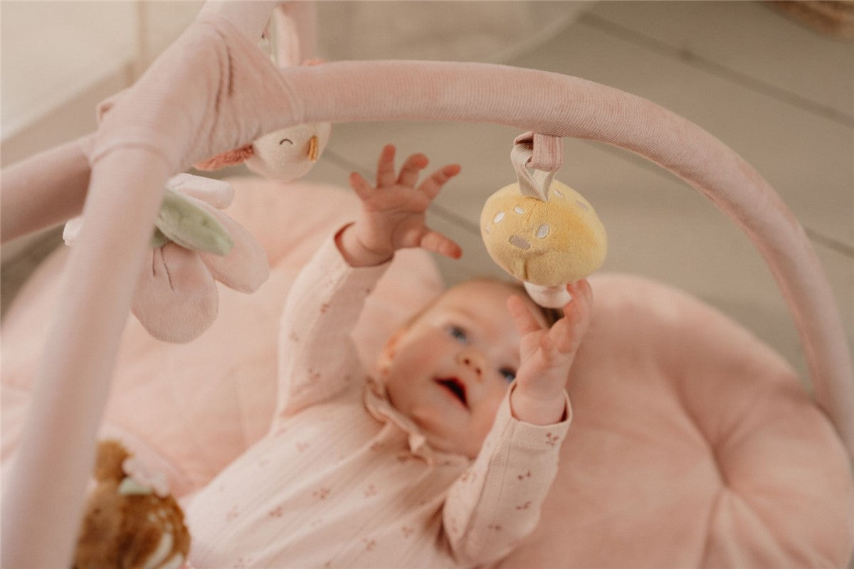 Cada día es una nueva historia en el jardín de los sueños. La alfombra de juego Fairy Garden Rosa de Little Dutch invita a tu bebé a explorar un mundo lleno de colores suaves, texturas y sonidos encantadores. Su diseño en forma de flor, con dos arcos aterciopelados y cinco peluches colgantes, estimula la vista, el tacto y el oído, acompañando a tu peque en sus primeros descubrimientos con ternura y seguridad.